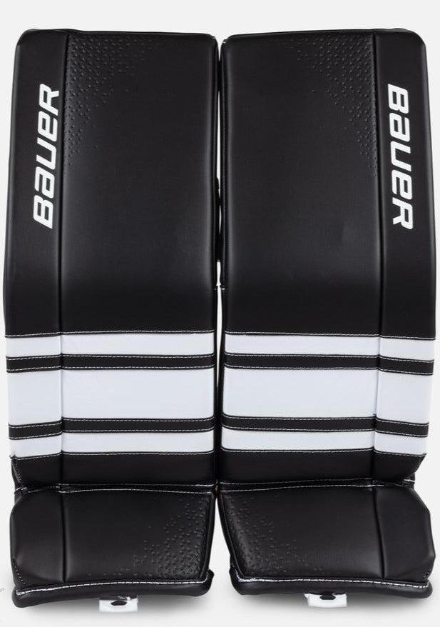 The Bauer GSX Goal Pad is for the rec goalie and provides the best spec for the price point. It combines the flex of Vapor's break above and below the knee, with the shape of Supreme. It has a TUNE FIT simple strapping system, and a butterfly assist pillow to provide extra support for the leg. Lastly, there's a 115 degree boot flex that allows for a greater range of motion.